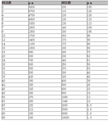 國際目數(shù)與微米對照表